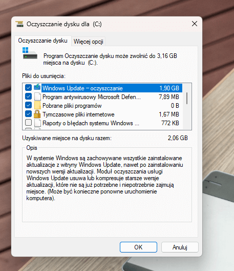 • Tymczasowe pliki internetowe (to pamięć podręczna przeglądarki, która często zajmuje dużo miejsca)